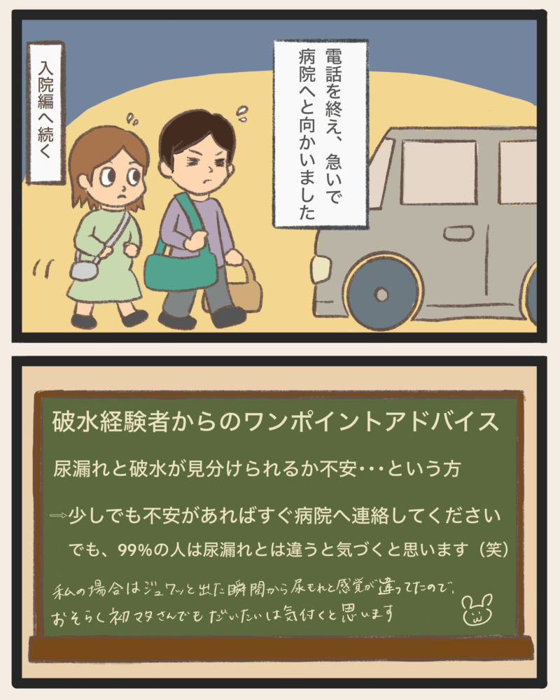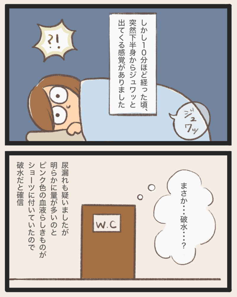 もしかして破水・・・?と、初産の私は戸惑いながら、トイレに向かうところから始まります。