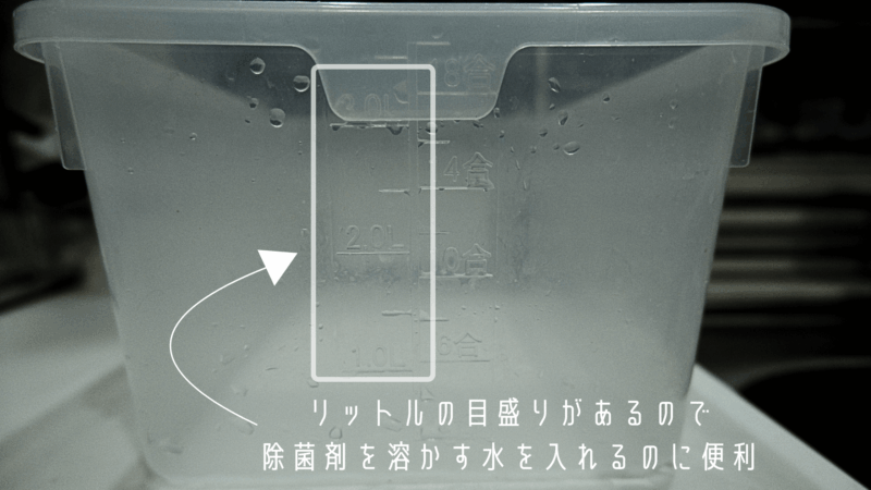 さらにこの米びつには、リットルの目盛りが付いているので、水と除菌剤を入れる際にめちゃくちゃ役立ちます。