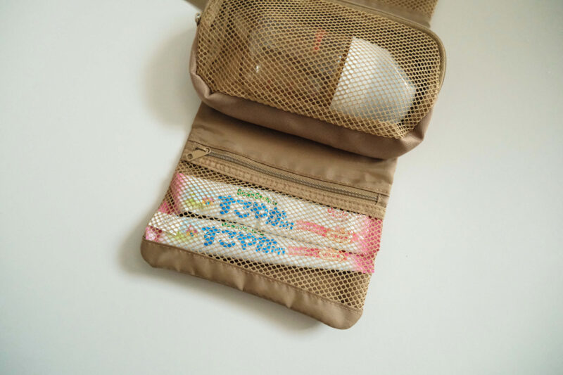 個人的には、支援センターや児童館など、日常使いには着脱ポーチ付きケース、旅行などの長時間外出のときには洗面用具ケースといった使い分けをするのもありです。